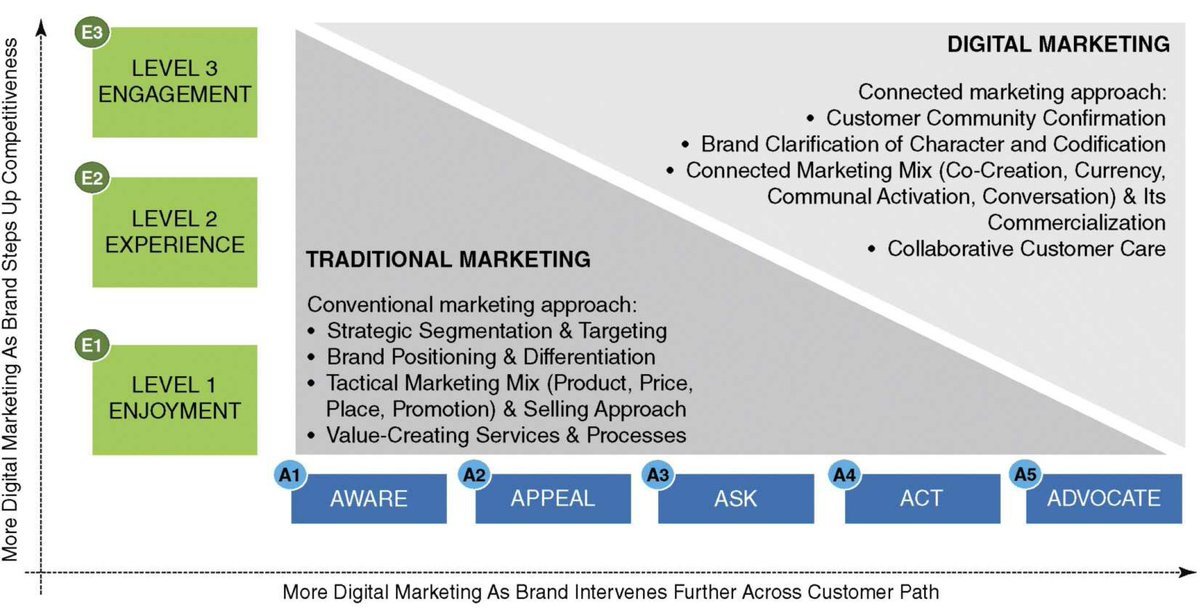 Na primeira fase de interação, o marketing tradicional desempenha um papel importante na criação de reconhecimento e interesse. Quando a interação evolui e os clientes exigem relações mais próximas com as empresas, a importância do digital aumenta.